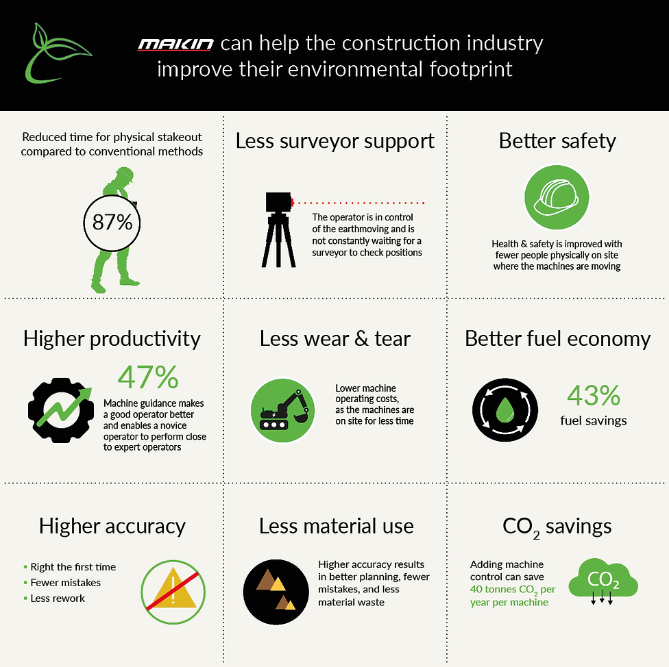 Adding productivity saving technology such as machine control is just one of many tools to help the construction industry improve their environmental footprint. The future is all about handling data to improve the efficiency on the construction sites of tomorrow. This will be at the core of Makin’s future development.